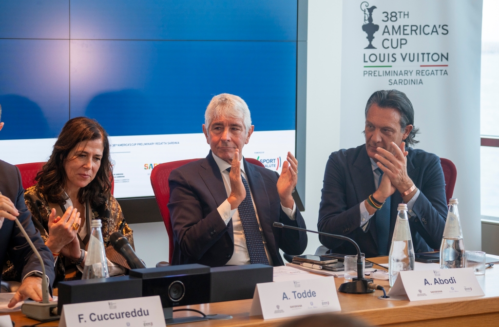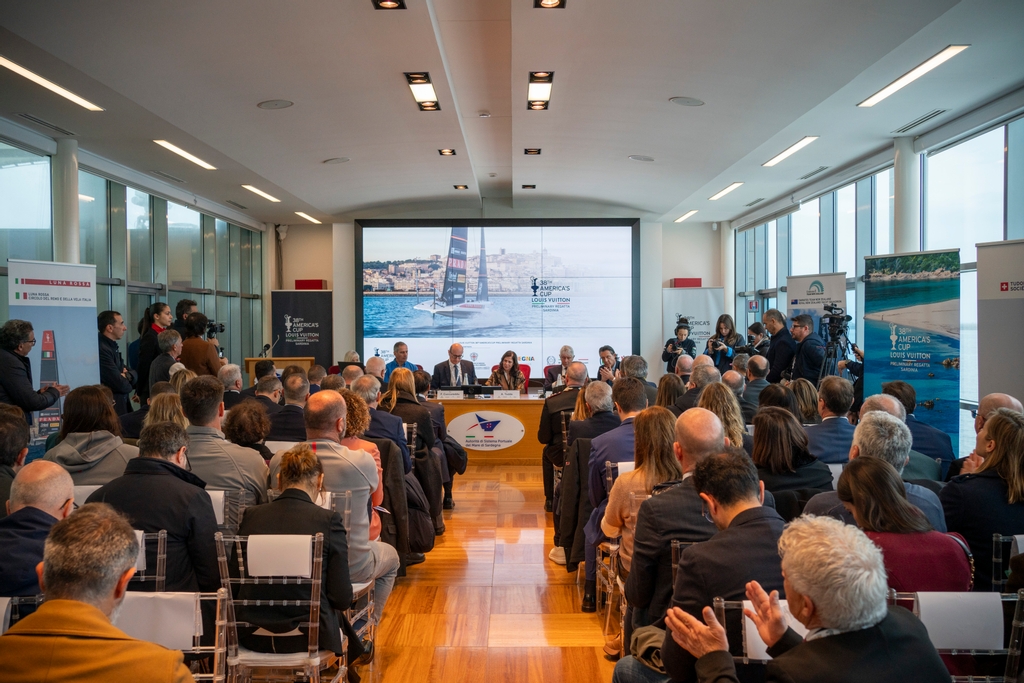 The press conference — moderated by the Regional Tourism Councillor of the Region of Sardinia, Franco Cuccureddu — was attended by Alessandra Todde, President of the Autonomous Region of Sardinia; Andrea Abodi, Minister for Sport and Youth; the CEO of Sport e Salute, Diego Nepi Molineris; and, via video link, the Mayor of Naples, Gaetano Manfredi. Also present in the room were Max Sirena, CEO of Luna Rossa, representatives of the teams competing in the 38th America’s Cup, and several institutional officials, along with port authorities and representatives of the Italian Navy. Representing ACE – America’s Cup Event– were Leslie Ryan and Luis Saenz de Mariscal.